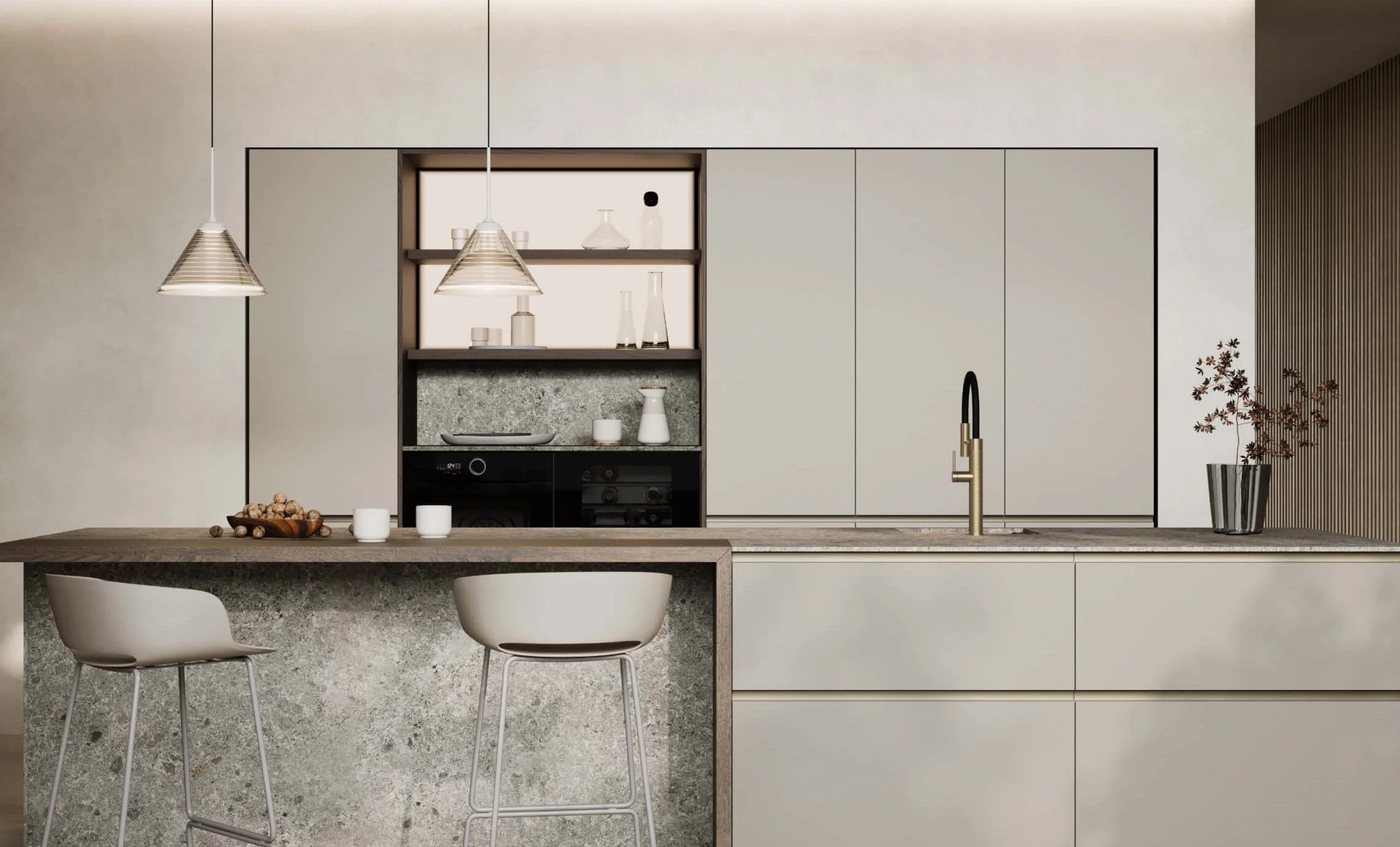 Puccini kitchens can be designed to be handleless or with an integrated rail built into the door. The handleless systems for your kitchens include the groove, integrated rail and push-pull mechanisms. Each one has its own advantages and disadvantages that should be considered when deciding on the right design for your new kitchen.